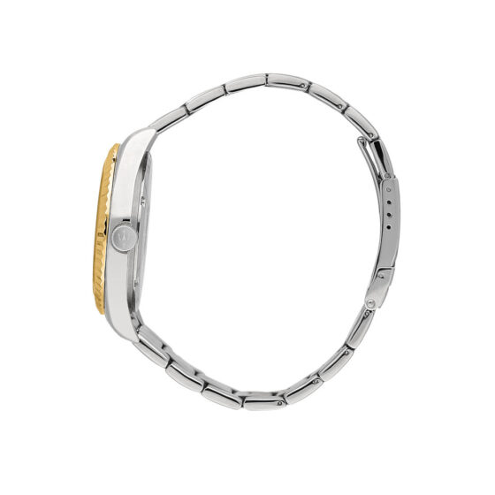 Γυναικείο ρολόι διαμέτρου 36mm με μηχανισμό QUARTZ ακριβείας. Έχει πράσινο καντράν και χρυσούς δείκτες. Η κάσα του είναι από ανακυκλωμένο ατσάλι χρυσού χρώματος με κρύσταλλο από ορυκτό κρύσταλλο ειδικής σκλήρυνσης και πέτρες. Έχει δίχρωμο, χρυσό και ασημένιο μπρασελέ από ανακυκλωμένο ατσάλι και κούμπωμα ασφαλείας.