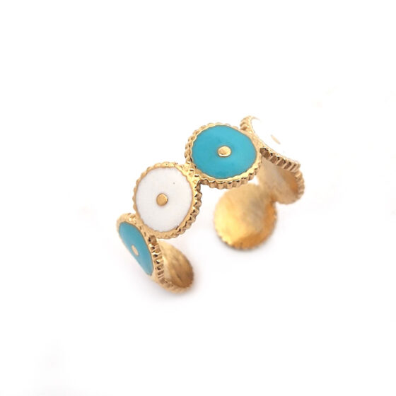 Υλικό: STAINLESS STEEL ΕΠΙΧΡΥΣΩΜΕΝΟ Size: Ανοιγόμενο / Open end Δαχτυλίδι άσπρα και γαλάζια ματάκια με σμάλτο
