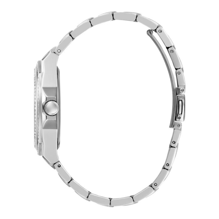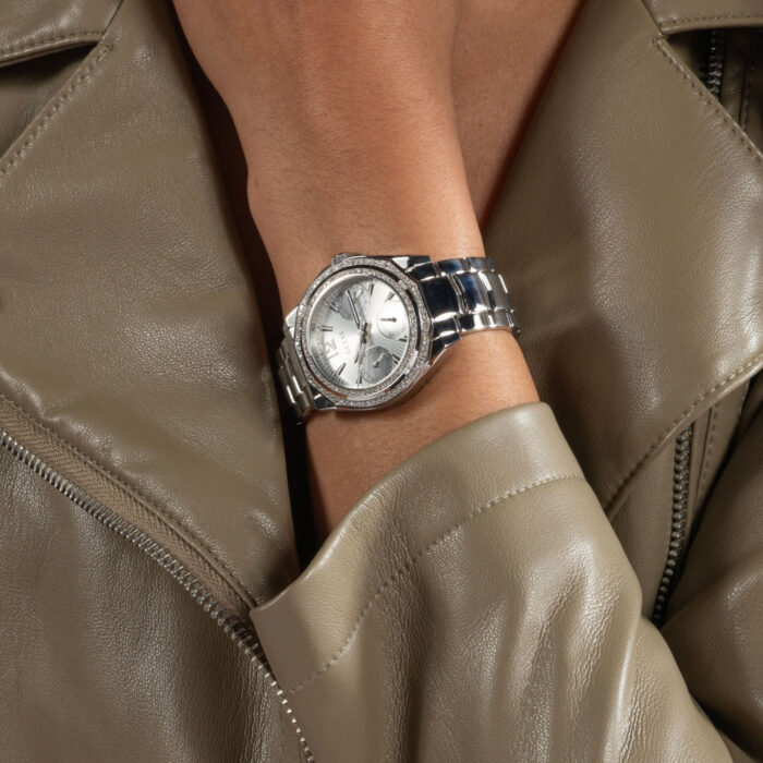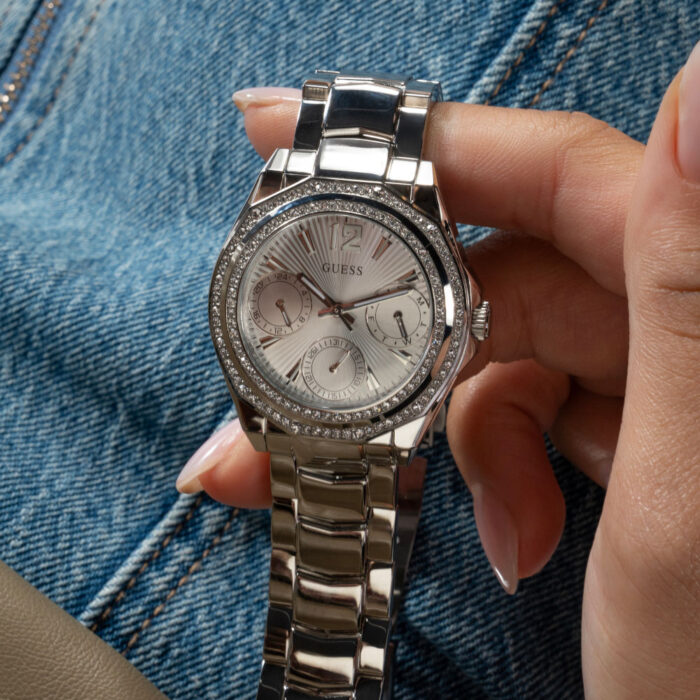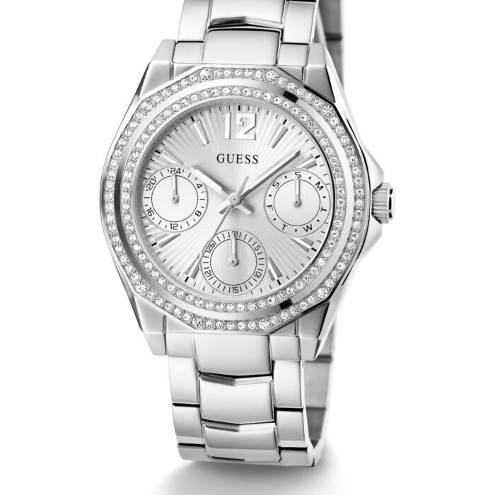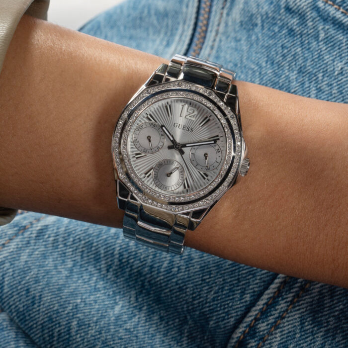 Γυναικείο ρολόι GUESS RITZY διαμέτρου 36mm, με μηχανισμό QUARTZ Multi-Function, ασημένιο καντράν, ασημένια κάσα και μπρασελέ από ανοξείδωτο ατσάλι.