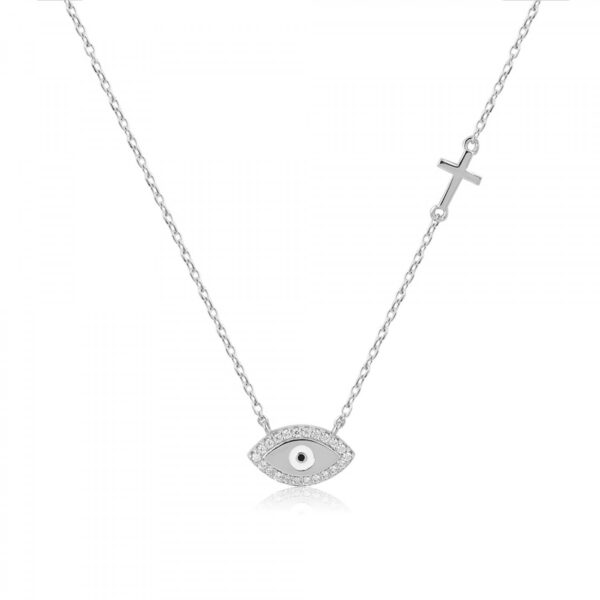 Υλικό : Ασήμι 925 Κολιέ άσπρο ματάκι με Σταυρουδάκι και ζιργκόν