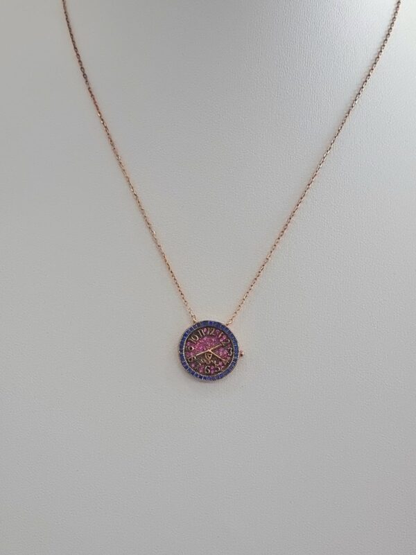 Ένα κομψό rose gold κολιέ με ενσωματωμένο ρολόι που αναδεικνύει τη γοητεία του χρώματος και επικεντρώνεται στην κομψή σχεδίαση. Η λιτότητα του κοσμήματος προσφέρει διακριτική και εκλεπτυσμένη εμφάνιση, ενώ το ρολόι προσθέτει λειτουργικότητα με στυλ.