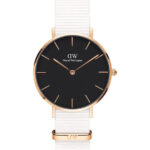 Γυναικείο ρολόι από την εταιρία Daniel Wellington, με το υφασμάτινο λουράκι σε λευκό χρώμα, κάνουν το ρολόι ιδανικό για καθημερινές άλλα και πιο επίσημες εμφανίσεις. Διαθέτει μηχανισμό μπαταρίας, ο οποίος βασίζεται στην ηλεκτρική ενέργεια που παράγει η μπαταρία, με αποτέλεσμα να υπάρχει ακρίβεια και αντοχή.