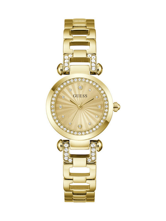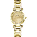 Γυναικείο ρολόι διαμέτρου 30mm με μηχανισμό QUARTZ ακριβείας. Έχει χρύσο καντράν με διαφανείς πέτρες και επίχρυσους δείκτες. Η κάσα του είναι από ανακυκλωμένο ατσάλι με χρυσές λεπτομέρειες. Έχει χρυσό μπρασελέ από ανακυκλωμένο ατσάλι και κούμπωμα ασφαλείας. Είναι αδιάβροχο (3 ΑΤΜ).