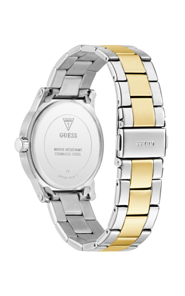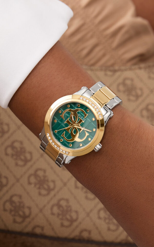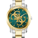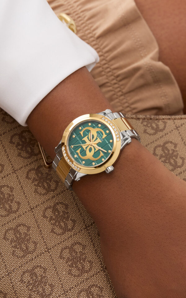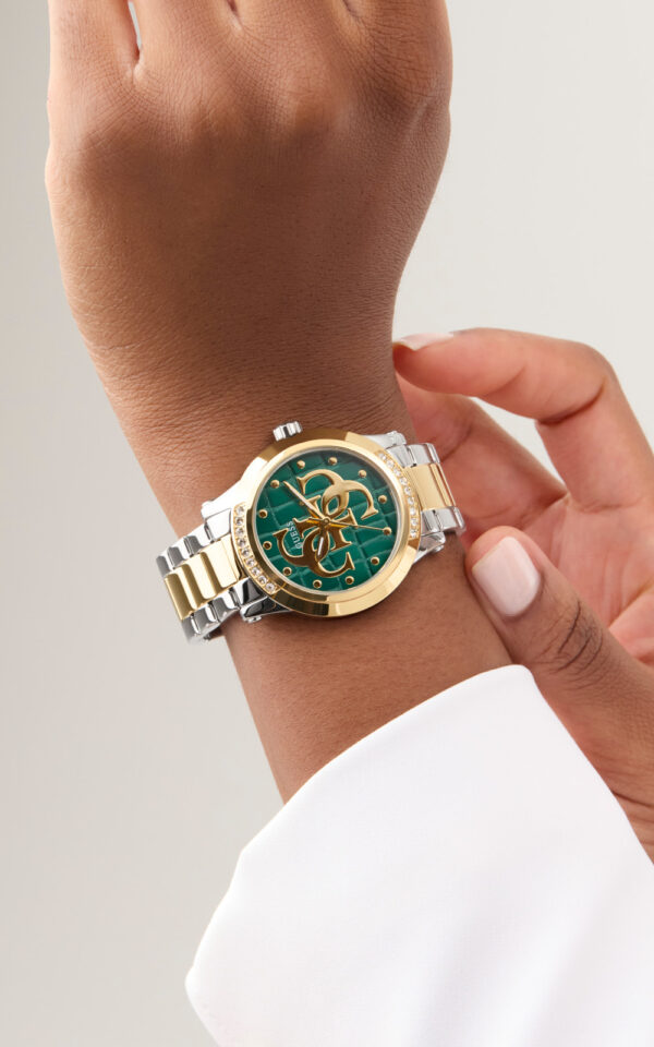 Γυναικείο ρολόι διαμέτρου 36mm με μηχανισμό QUARTZ ακριβείας. Έχει πράσινο καντράν και χρυσούς δείκτες. Η κάσα του είναι από ανακυκλωμένο ατσάλι χρυσού χρώματος με κρύσταλλο από ορυκτό κρύσταλλο ειδικής σκλήρυνσης και πέτρες. Έχει δίχρωμο, χρυσό και ασημένιο μπρασελέ από ανακυκλωμένο ατσάλι και κούμπωμα ασφαλείας.