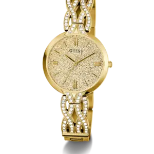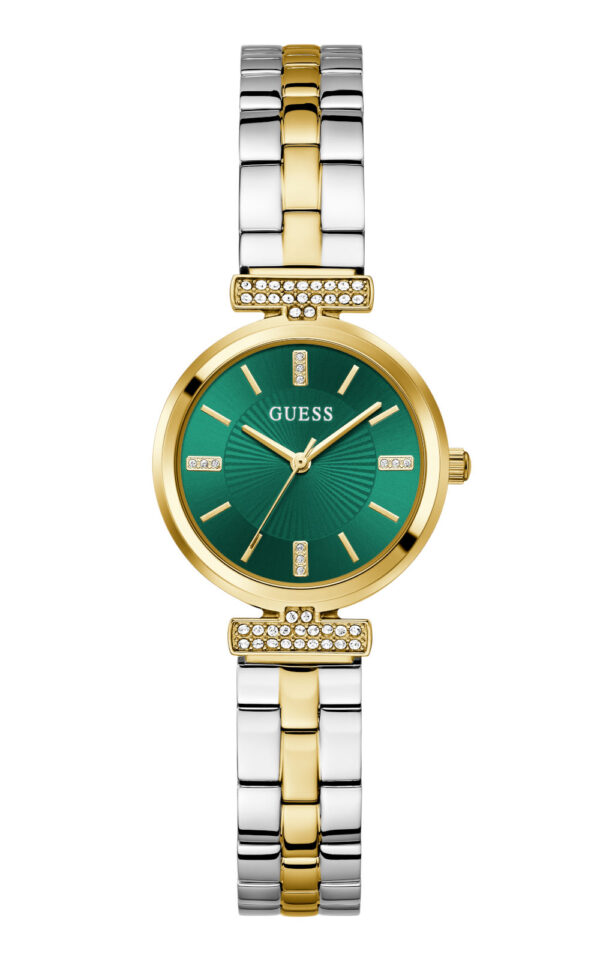 Γυναικείο ρολόι GUESS ARRAY διαμέτρου 28mm, με μηχανισμό QUARTZ ακριβείας, πράσινο καντράν και μπρασελέ ασημένιο- χρυσό από ανακυκλωμένο ατσάλι.