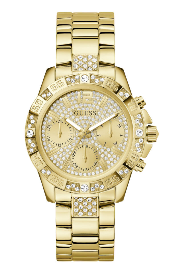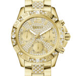 Γυναικείο ρολόι GUESS MAJESTY διαμέτρου 40mm, με μηχανισμό Quartz multifuction ακριβείας, χρυσό καντράν και μπρασελέ από ανακυκλωμένο ατσάλι.