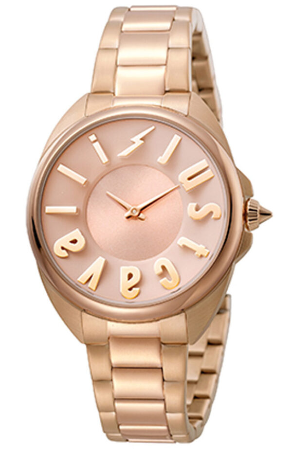 Γυναικείο ρολόι χειρός Just Cavalli από ροζ επιχρυσωμένο ανοξείδωτο ατσάλι με ροζ χρυσό καντράν και μπρασελέ.