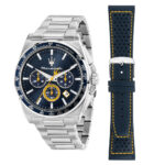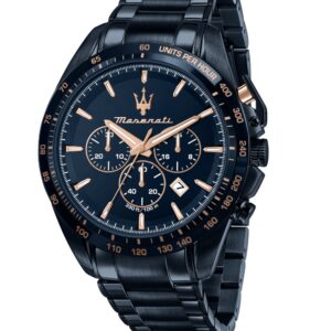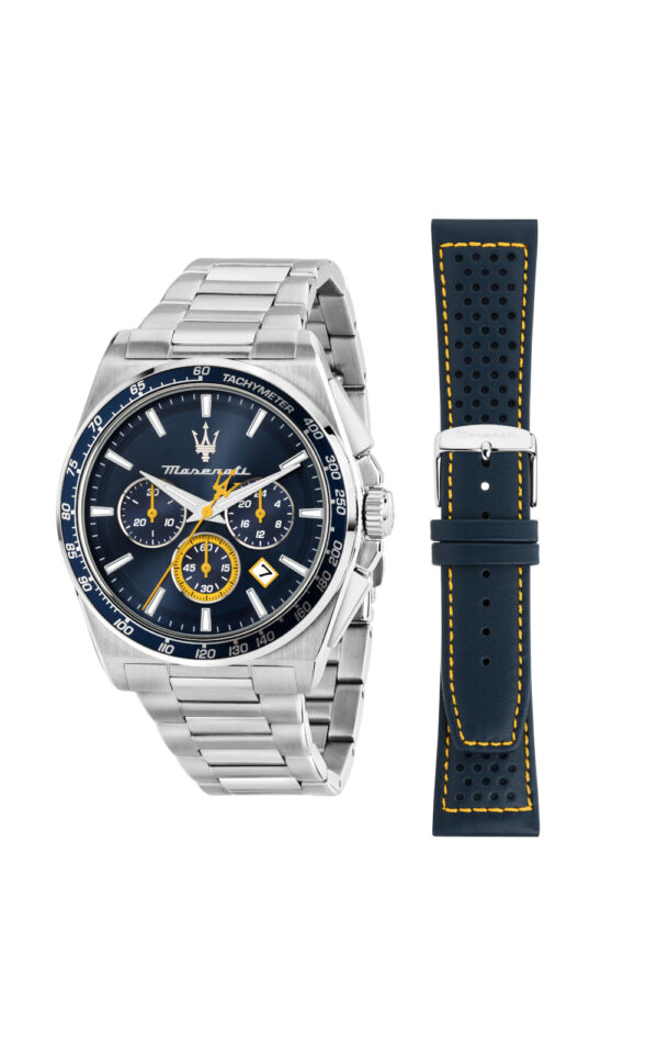 Ανδρικό ρολόι MASERATI VELOCITA διαμέτρου 43mm, με μηχανισμό Quartz χρονογράφος ακριβείας, μπλε καντράν, κάσα και μπρασελέ από ανοξείδωτο ατσάλι και μπλε λουράκι από δέρμα.