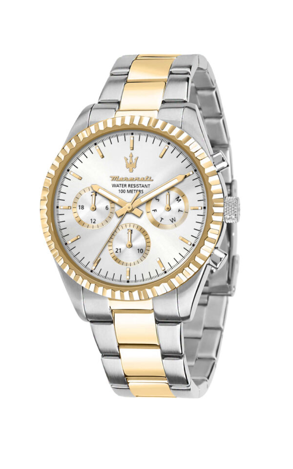 Αντρικό ρολόι διαμέτρου 43mm με μηχανισμό QUARTZ Multi-Function ακριβείας. Έχει ασημένιο καντράν με επίχρυσους δείκτες και λεπτομέρειες. Η κάσα του είναι από ανοξείδωτο ατσάλι με επίχρυσες λεπτομέρειες και κρύσταλλο από ορυκτό κρύσταλλο ειδικής σκλήρυνσης. Έχει μπρασελέ από ανοξείδωτο ατσάλι με επίχρυσες λεπτομέρειες και κούμπωμα ασφαλείας. Είναι αδιάβροχο (10 ATM).