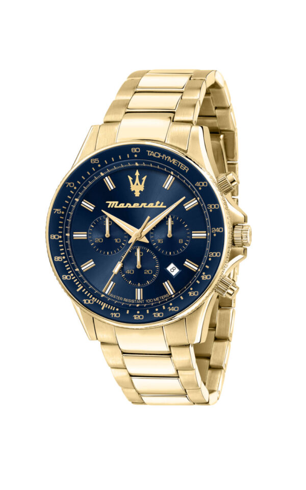 Ανδρικό ρολόι MASERATI SFIDA διαμέτρου 44mm, με μηχανισμό QUARTZ χρονογράφου ακριβείας, μπλε καντράν, κάσα και μπρασελέ από ανοξείδωτο ατσάλι.