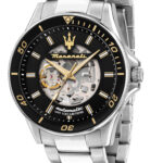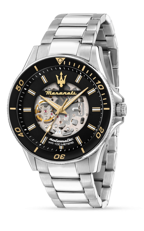 Έχει μαύρο καντράν με χρυσούς δείκτες και λεπτομέρειες και εμφανή μηχανισμό.