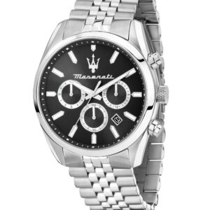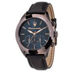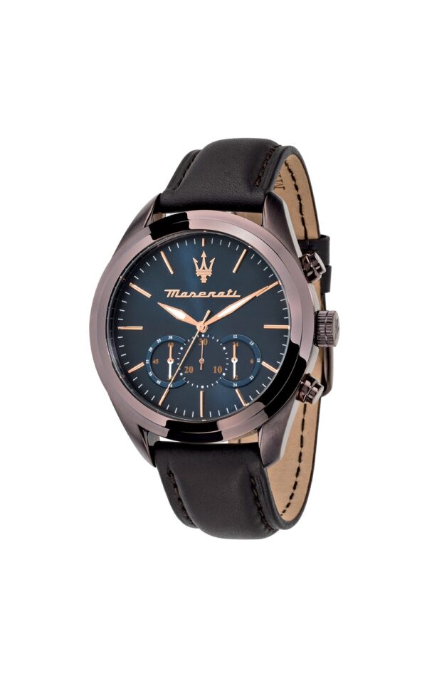 Ανδρικό ρολόι MASERATI TRAGUARDO διαμέτρου 45mm, με μηχανισμό Quartz χρονογράφου ακριβείας, έχει μπλε καντράν, κάσα από ανοξείδωτο ατσάλι και καφέ δερμάτινο λουράκι.