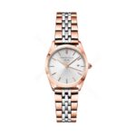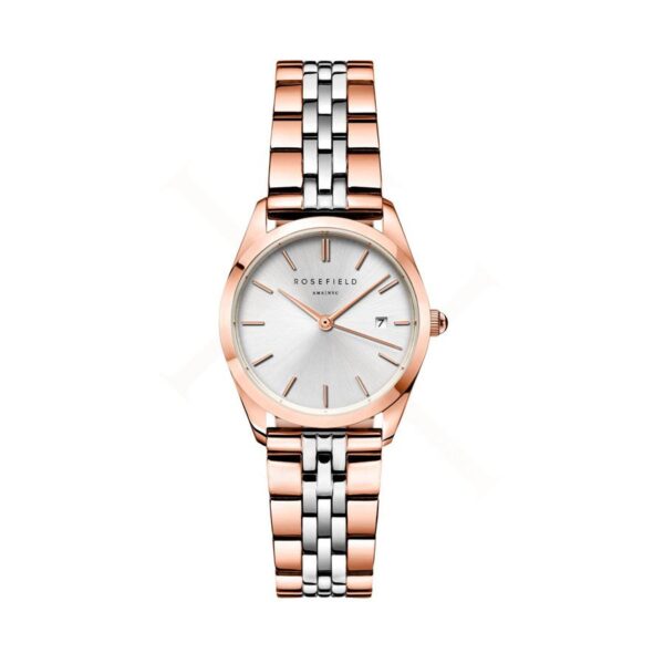 Γυναικείο ρολόι Rosefield της σειράς Ace XS από ανοξείδωτο ατσάλι με ένδειξη ημερομηνίας στο ασημί καντράν του. Το δέσιμο γίνεται με δίχρωμο μπρασελέ.
