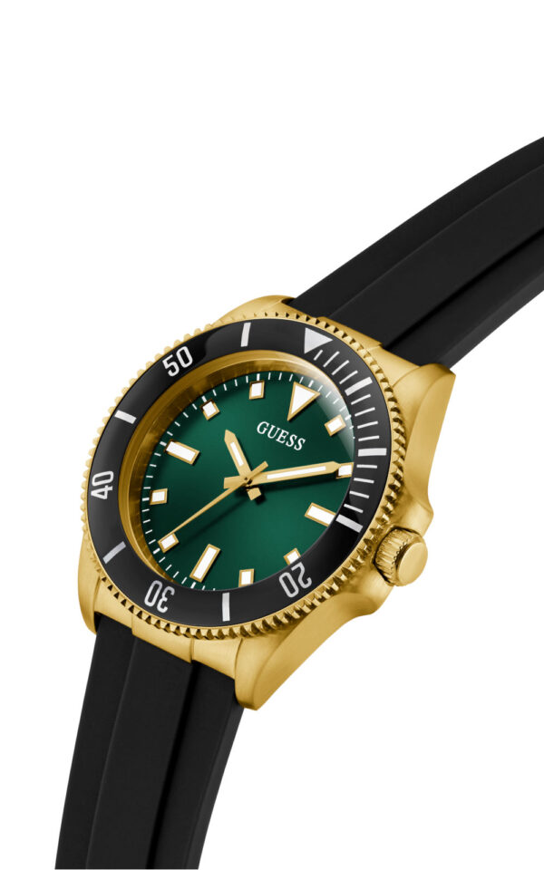 Ανδρικό ρολόι διαμέτρου 41mm με μηχανισμό QUARTZ ακριβείας. Έχει πράσινο καντράν με χρυσούς δείκτες και λεπτομέρειες. Η κάσα του από ανακυκλωμένο ατσάλι, με κρύσταλλο από ορυκτό κρύσταλλο ειδικής σκλήρυνσης. Έχει μαύρο λουράκι από καουτσούκ και κούμπωμα τοκάς. Είναι αδιάβροχο (5 ΑΤΜ)