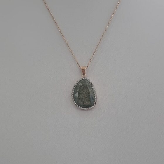 Κολιέ 925 – Επικάλυψη Rose Gold Το κολιέ αυτό διαθέτει ένα λαμπερό Λαδί χώμα κρύσταλλο με επίστρωση rose gold, προσδίδοντας του μια ρομαντική αίσθηση. Η λάμψη του κρυστάλλου συνδυάζεται με την κομψή απόχρωση του rose gold, δημιουργώντας ένα κομψό και μοναδικό κομμάτι κοσμήματος που ξεχωρίζει.